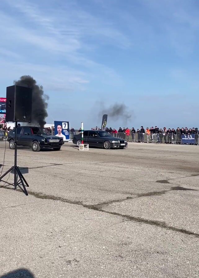 two vehicles participating in a drag race event. A gray Volkswagen Golf Mk2 and a black Mercedes-Benz W124 are positioned side by side at the starting line, and begin to accelerate, creating a large cloud of black smoke. A crowd of people is standing behind a barrier along the edge of the track, watching the race. There are loudspeakers and flags alongside the track. The sky is blue with scattered clouds, and the race track is an asphalt surface with faded lane markings. The vehicles speed away from the starting line, kicking up dust as they go.