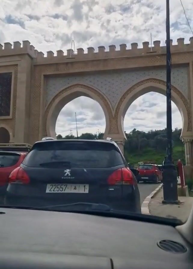 view from inside a car, stopped in traffic, looking towards an ornate archway. The archway is beige with white decorative detailing and consists of two large, Moorish-style arches. Behind the arches, green trees and shrubs are visible. Above the arches is a crenellated design. In the foreground, the back of a black Peugeot SUV is visible, with a Moroccan license plate. Behind the Peugeot, several other cars are stopped in traffic. The sky is partly cloudy, with the sun peeking through. A street light pole is located on the right of the frame. A Moroccan police vehicle with red and green stripes drives past on the left. The dashboard of the car the video is shot from is also visible.