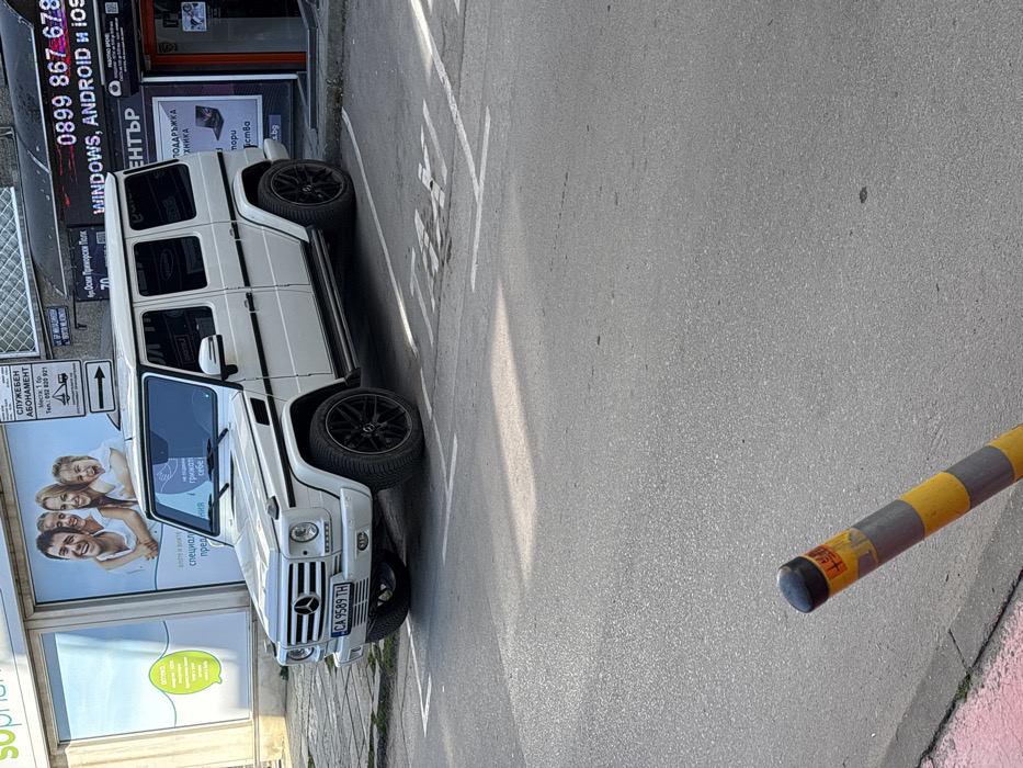 The image depicts a white Mercedes-Benz G-Class (G-Wagen) SUV parked on an asphalt street in Varna, Bulgaria, specifically on General Osip Primorski Polk Street, indicated by a visible sign. The vehicle, bearing Bulgarian license plate "CA 9589 TH", is positioned partially within a marked parking space designated for taxis, with the word "TAXI" painted in white on the asphalt beneath its front section. The G-Wagen features black multi-spoke wheels and appears to be clean. To the left of the vehicle, a storefront with large windows displays a "Sopharmacy" advertisement featuring a smiling family. To the right, another storefront functions as an electronics repair center, evidenced by illuminated signs displaying phone numbers "0899 867 678" and services like "WINDOWS, ANDROID и iOS". No individuals are visible in proximity to the vehicle or storefronts. In the bottom-left foreground, a yellow and gray striped bollard with a black cap is partially visible, leaning slightly to the right. The asphalt pavement shows minor wear and painted white lines marking parking boundaries. The scene is illuminated by natural daylight, casting shadows on the street surface.