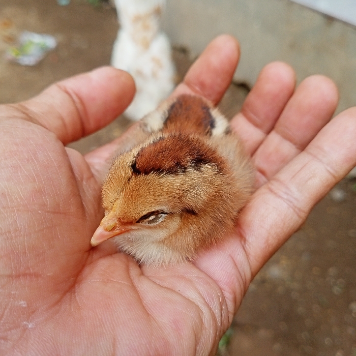 - "The image depicts a small, light brown chick with darker brown markings on its head and back, resting within the open palm of a human hand" by FM-cHJi83, licensed under CC BY 4.0