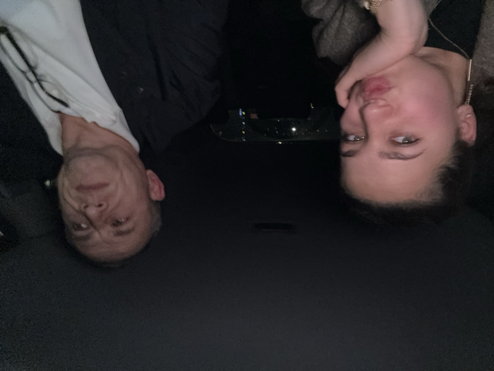 Two faces are seen against a dark background, seemingly upside down. On the left, an older man with short, light hair wears a white shirt and dark jacket, spectacles visible on his shirt. On the right, a younger woman with dark hair poses with her hand near her face, a slight pucker to her lips. The lighting is dim, revealing minimal details of the surrounding environment.