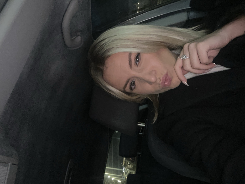A young woman with blonde hair sits in a car, angled slightly toward the camera. She has a light complexion, and her lips are pursed in a kiss. A ring is visible on her left hand. She wears a dark jacket, and the car's interior is also dark, with a headrest and a grab handle visible. Outside the window are blurred lights. The image has a casual, selfie-style appearance.