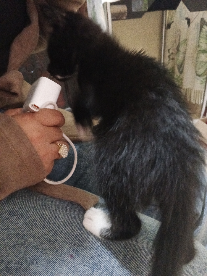 The image depicts a close-up indoor scene. A human's right hand and forearm, clothed in a light brown long-sleeved garment, are positioned on a lap covered by blue denim jeans. The hand holds a white, rectangular electronic power adapter, from which a white cable extends. A gold-toned ring with a fan-shaped arrangement of small white spherical elements is worn on the human's ring finger. A black kitten, identifiable by a prominent white right front paw, stands on the denim-covered lap, facing and observing the power adapter. Its head is lowered towards the device. The kitten's fur appears dense and somewhat disheveled. The background consists of indistinct indoor elements, including a light-colored fabric with a green leaf pattern visible in the upper right quadrant. The precise location within Popayán, Colombia, or any other city, cannot be determined from the visual information provided.