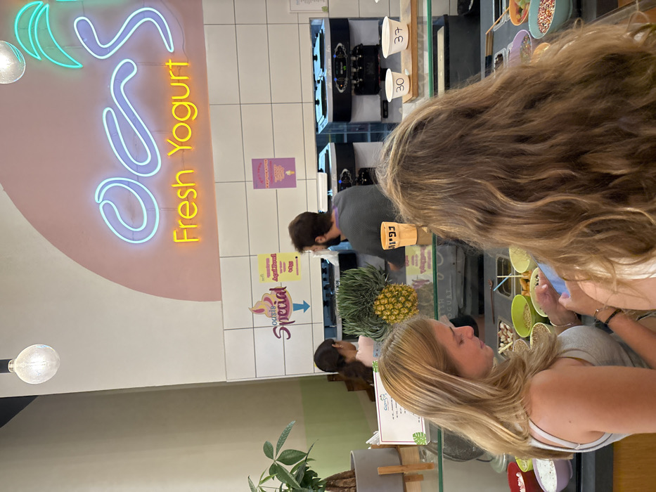 The image depicts the interior of a yogurt shop named "Oasis Fresh Yogurt" in Kadima - Zoran, Israel