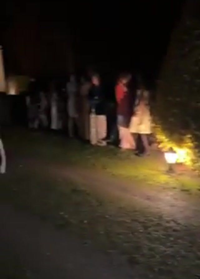 At night, on a dirt path in front of a French château, a fashion model walks toward the camera during a fashion show. The model is tall and slim, wearing a black t-shirt and vertically striped pants. Behind the model on the right is a line of spectators, mostly women, watching the show. Light is provided by small lanterns placed on the ground.