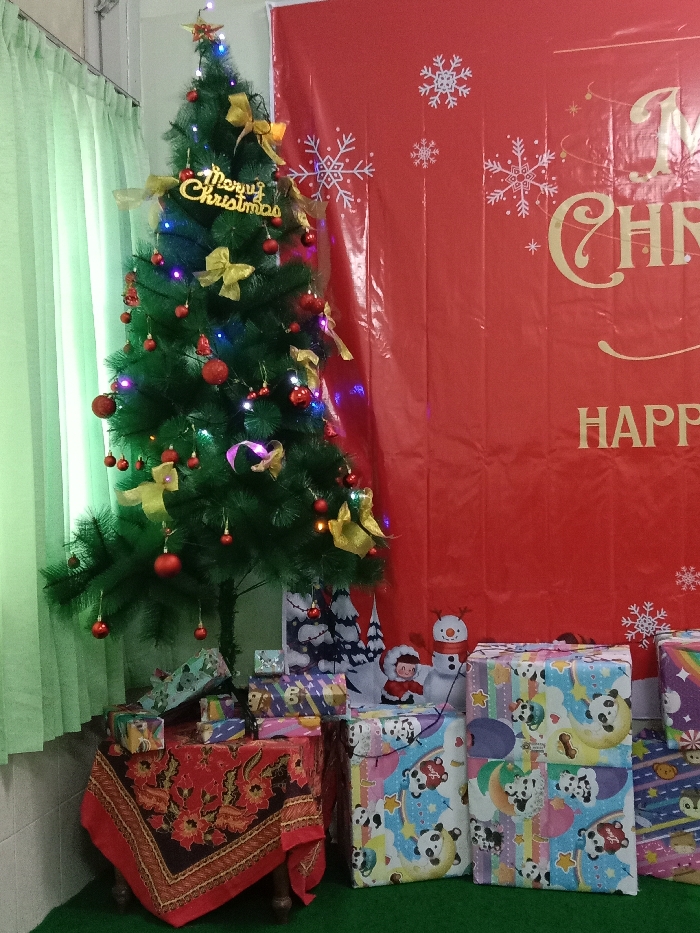 The image displays an indoor Christmas holiday decoration setup located in Madiun, Indonesia