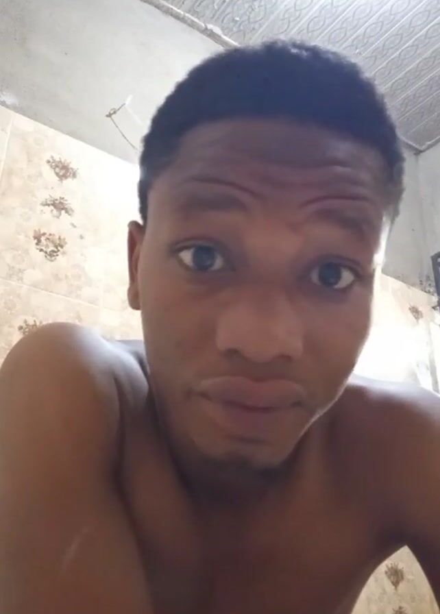 A shirtless, dark-skinned man with short, dark hair looks at the camera in a bathroom. The background includes tiled walls with a floral pattern and a ceiling with a textured design. The man shifts his gaze slightly and briefly raises his hand towards the camera.