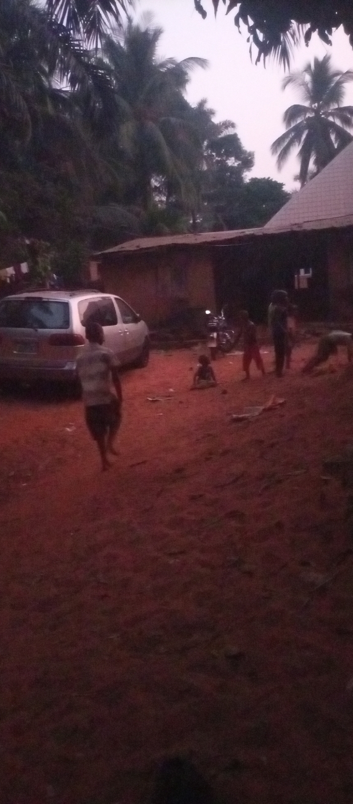 A silver minivan sits near a dilapidated building with a rusty roof, a motorcycle parked nearby. Several children occupy the reddish dirt yard: one walks toward the viewer, balancing something on his head, while others play. Lush green vegetation, including palm trees, fills the background, suggesting a tropical or subtropical setting. The scene is dimly lit, possibly at dusk, contributing to an overall sense of rural simplicity.