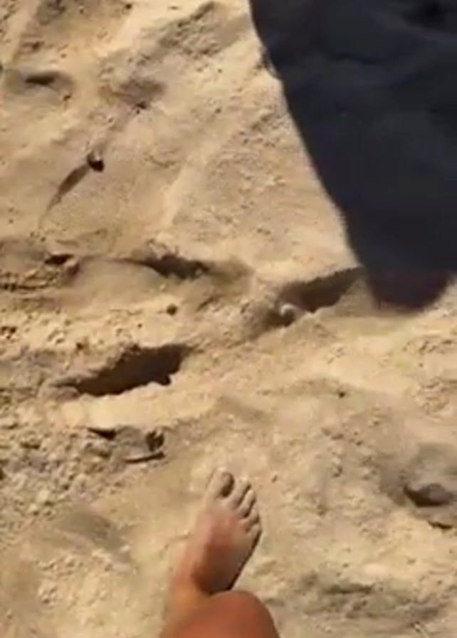 A person walks barefoot on sand
