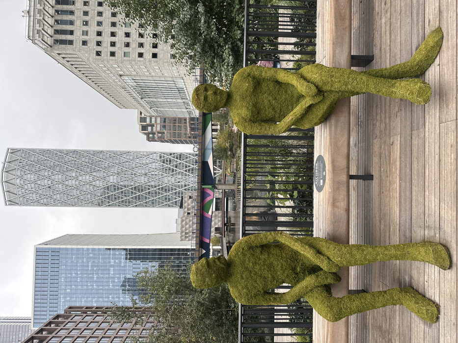 - "The image displays two life-sized, human-form sculptures covered in green moss, seated on a light-colored wooden bench in Canary Wharf, London, United Kingdom" by FM-tAd7y1, licensed under CC BY 4.0