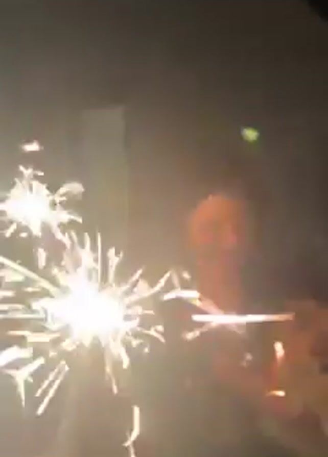A woman smiles while holding a sparkler, a glass of wine, and a Pomeranian dog