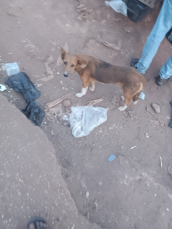 A medium-sized, brown dog with white paws stands among scattered trash on bare earth