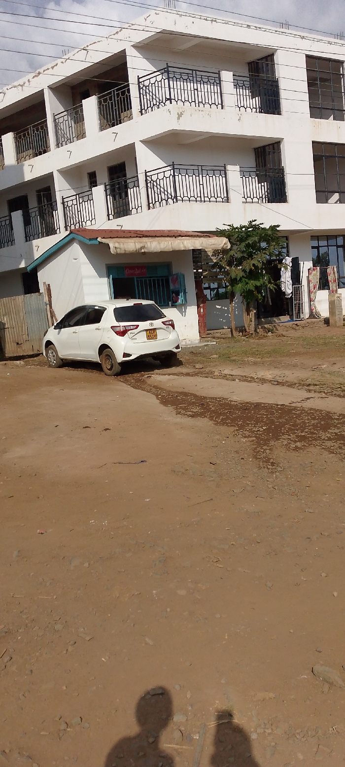 The scene depicts an outdoor environment in Bondo, Kenya, featuring a multi-story white building, a smaller single-story structure, a parked white vehicle, and an unpaved dirt ground