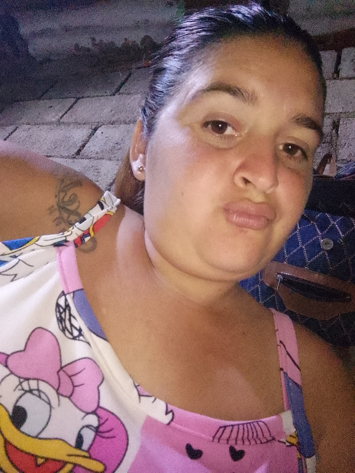 A woman poses for a selfie. Her dark hair is pulled back, highlighting her face. She has light skin, brown eyes, and is making a kissing face. She wears a white tank top with cartoon characters. A tattoo is visible on her left arm. The background features a wall constructed of cinder blocks. A blue patterned bag is behind her.