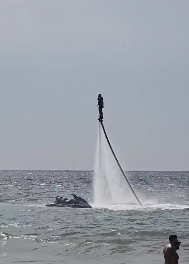 person flyboarding on the ocean. The flyboarder is standing atop a stream of water propelled by a jet ski below. The flyboarder's silhouette is clear against the sky. The jet ski is connected to the flyboard by a hose. In the foreground, people stand in the shallow water, watching. The weather appears sunny but hazy, with a calm sea and a few small boats visible in the distance.