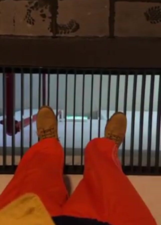 first-person point of view of someone wearing orange pants and brown work boots, sitting with their legs extended over a metal grate. Below the grate is a concrete area with a red pipe and a rectangular object with a green light on it. Above the grate, the concrete is stained with shoe prints. The camera gradually zooms in on the space below the grate.