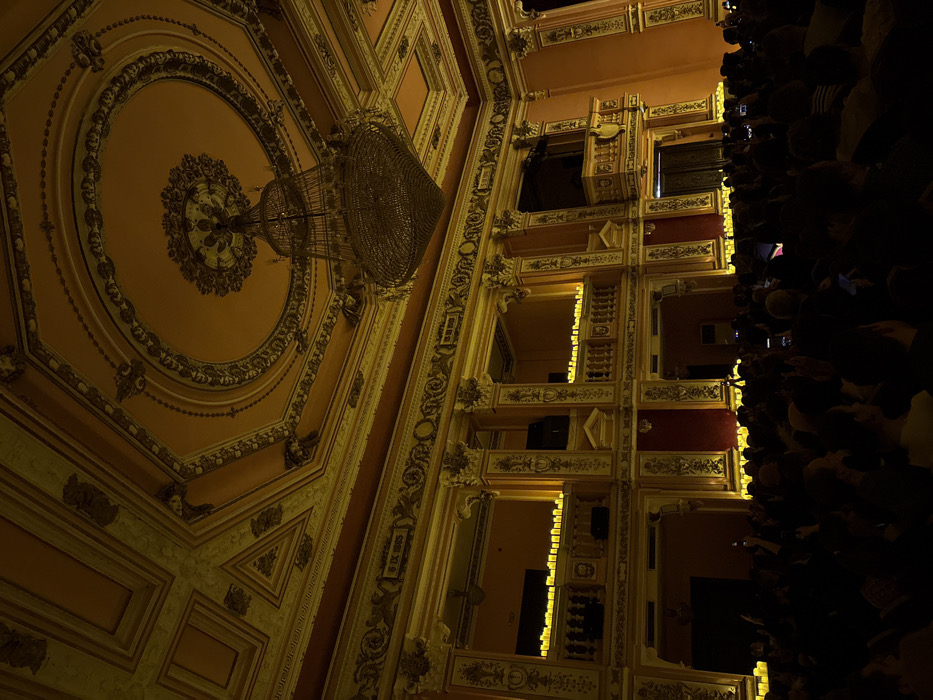 The image depicts the Plenary Hall of the National Assembly of Bulgaria in Sofia, distinguished by its opulent, historic architecture and the inscription "6 IX 1885" on an upper frieze. The scene is illuminated by dim, warm, artificial light. The ceiling is high and features a central circular medallion from which a large, multi-tiered crystal chandelier hangs. The entire ceiling and upper wall sections are richly decorated with gilded classical moldings, stucco work, and coffers, set against a background of reddish-orange and gold. Below the ceiling, multiple architectural tiers are visible, including balconies with balustrades supported by ornate columns and pilasters. Rows of numerous artificial LED candles line the ledges and railings of these balconies, providing the primary light source. The lower portion of the hall is occupied by a large audience, largely silhouetted in shadow. Many individuals in the crowd are holding up illuminated smartphones, suggesting they are actively recording or photographing the event.