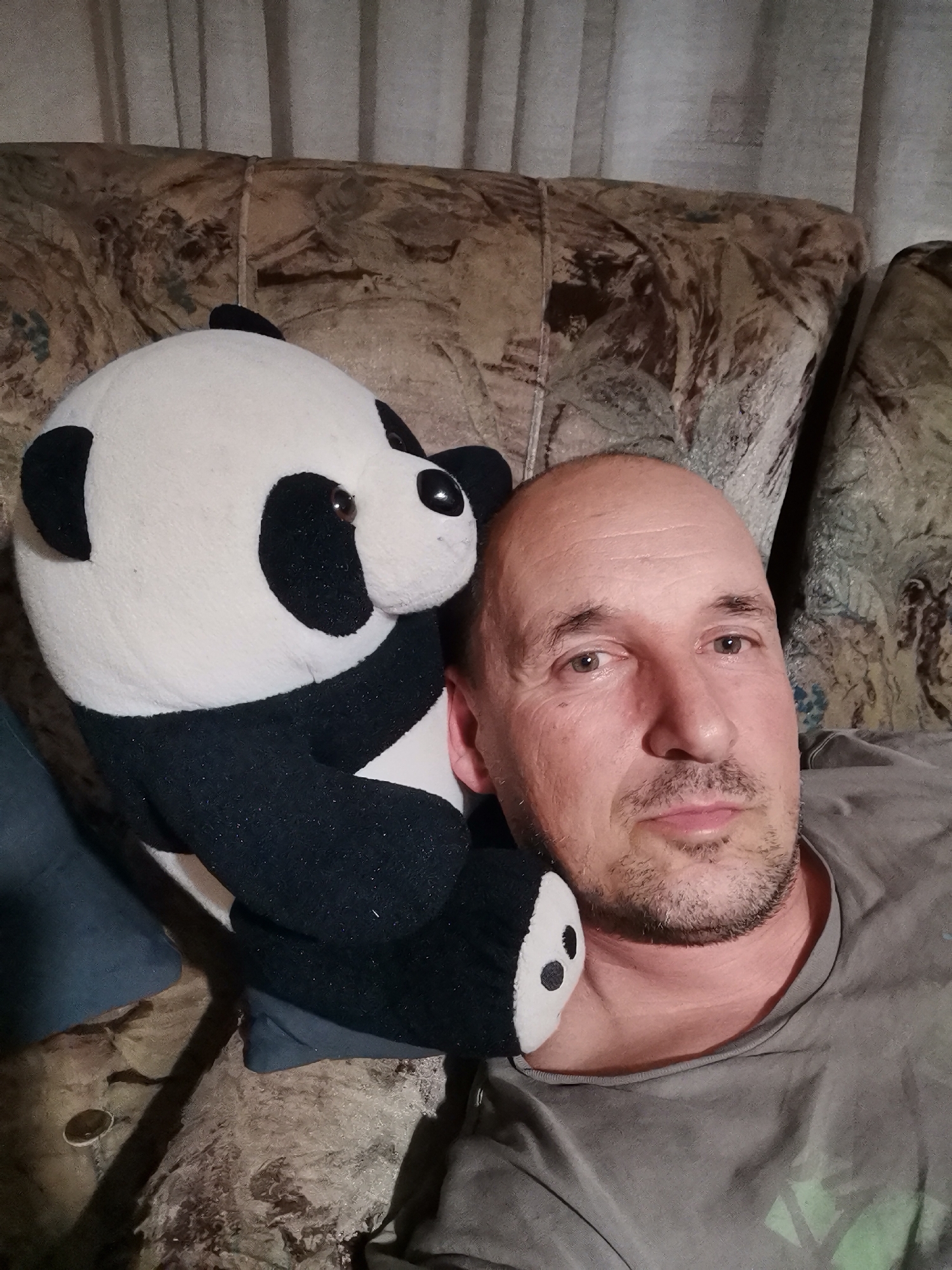 This image depicts an indoor scene in the city of Obrochishte, Bulgaria. A single adult male subject is positioned in the foreground, lying on his back, with his head turned slightly towards the camera. He has a light stubble beard and is wearing a plain grey t-shirt. His eyes are open, and his expression is neutral. To the left of the man's head, a large black and white panda plush toy is resting, its body partially obscured by the man's shoulder and neck area. The background consists of an upholstered sofa or couch with a dark, abstract patterned fabric in shades of brown and tan. Above the sofa, light-colored curtains are visible. A blue fabric or cushion is partially visible to the lower left of the panda toy. The scene is illuminated by an artificial light source.