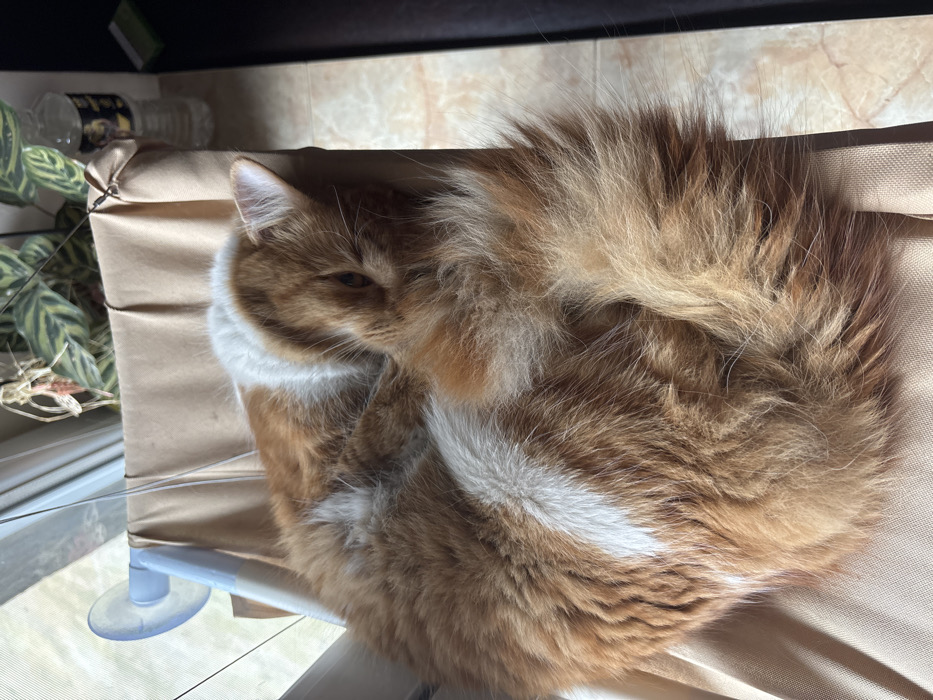 - "An orange and white domestic cat is depicted curled tightly in a beige fabric window hammock, resting or sleeping" by FM-fHPOX2, licensed under CC BY 4.0