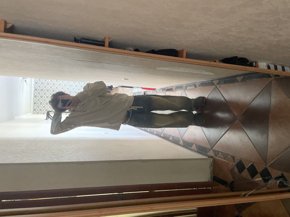 The scene depicts an individual captured in a full-length mirror selfie within an indoor residential hallway, reportedly located in Krasnoyarsk, Russia. **Subject:** A single individual, appearing male, is reflected in the mirror. Their face is obscured by a black smartphone held in their left hand, presumably used to capture the image. The person has curly dark hair. They are wearing a light-colored (beige or off-white) hooded sweatshirt and dark denim jeans that exhibit significant fading or discoloration to a yellowish-brown hue on the thighs and knees. A thin white drawstring or belt is visible around their waist. Dark-colored shoes or sneakers are worn on their feet. Their right arm is bent with the hand positioned behind their head/neck. **Environment:** The setting is a narrow hallway. The floor is tiled with a geometric pattern consisting of large brown squares flanked by triangular tiles in shades of brown, black, and beige. The walls are painted a light, neutral color, possibly off-white or beige. On the left side of the frame, a dark wooden door frame is visible. On the right, the full-length mirror, encased in a light wooden frame, leans against the wall. To the right of the mirror, a narrow wooden shelf is mounted, holding a black cylindrical object. Further down the hallway, visible in the mirror's reflection and past the subject, is a wall with patterned wallpaper (light background with darker ornate designs) and a ceiling fan on the ceiling. The lighting appears bright and uniform, suggesting an indoor daytime setting.