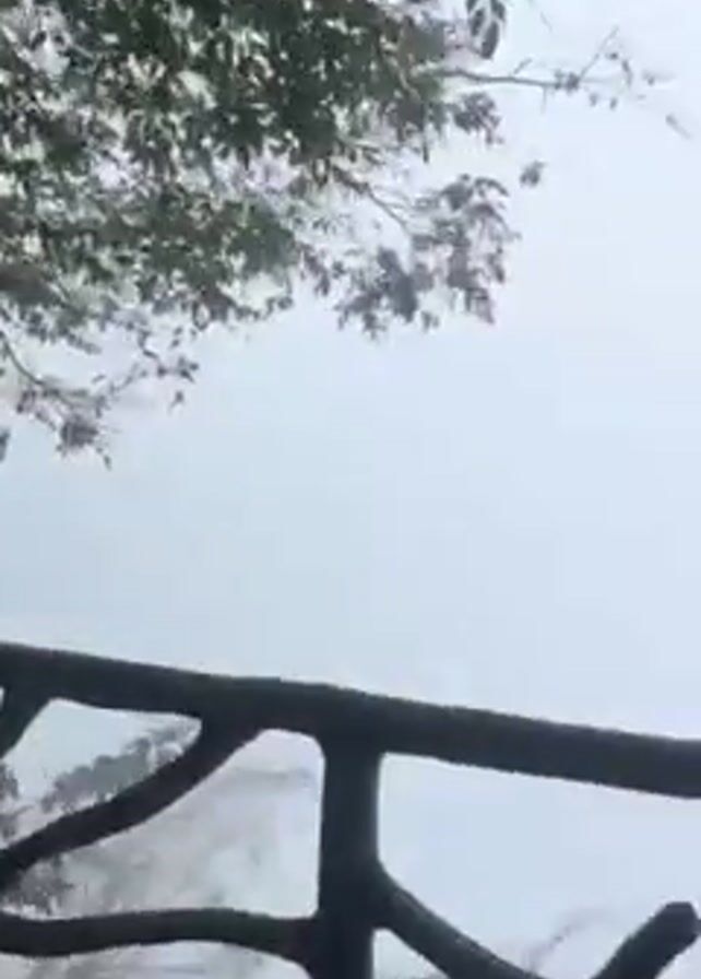 foggy landscape from behind a decorative railing that resembles branches. The view is partially obscured by trees, and people can be seen walking along a path behind the railing. The weather appears damp and overcast.