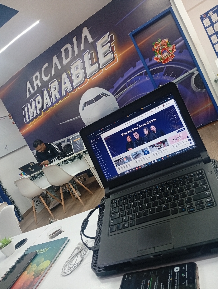 The scene is an interior office or training room at Arcadia Centro de Entrenamiento Aeronáutico, located at Carrera 19, entre calles 8 y 9, Edificio Centro Empresarial Barquisimeto, Piso 10, Oficina 102, Barquisimeto, Lara, Venezuela. In the immediate foreground, a black laptop rests open on a cooling pad on a white table. Its screen displays a webpage from arcadia-imparable.com, titled "Bienvenidos Arcadianos," featuring images of four individuals and various articles. A black smartphone lies face-up beside the laptop. To the left, a spiral-bound notebook labeled "SPACE NOTAS" is visible, along with a small potted succulent, a small brown dish containing dark items, and a cluster of paper clips. Wires are connected to the laptop. In the midground, a white rectangular table with two white chairs, each with wooden legs, is positioned. The table's edge is decorated with green Christmas tinsel. Further back, a male individual is seated at another white desk, facing away from the camera, occupied with a laptop or documents. He is wearing a dark, long-sleeved top with white stripes. The background features a large blue banner on the wall displaying the text "ARCADIA IMPARABLE" in white and an illustration of the nose section of a white passenger airplane. To the right of the banner, a blue door frame or decorative archway is visible, adorned with a red, green, and gold Christmas bell ornament. On the far right, a white bulletin board with multiple documents pinned to it is present. The room is illuminated by overhead fluorescent lighting.