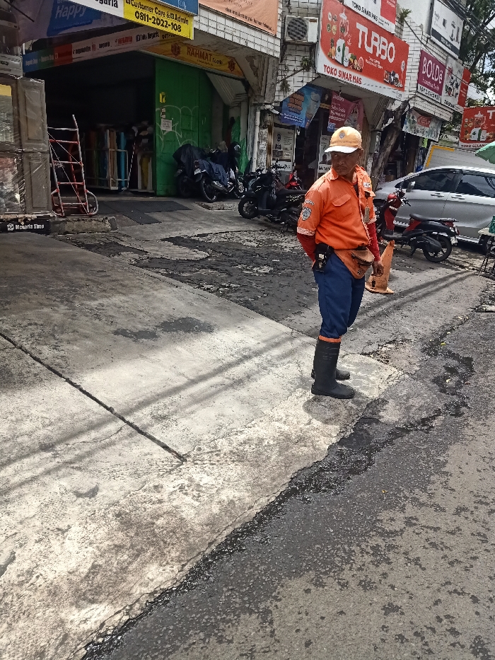 A man in an orange shirt, blue pants, and black boots stands on a street near storefronts with various signs, including "TURBO" and "RAHMAT." Motorcycles are parked nearby, and a silver car is visible in the background. The street surface appears to be a mix of concrete and asphalt. The man has a light-colored hat and a fanny pack. A traffic cone sits on the sidewalk next to him. Overhead wires and storefront awnings add to the urban setting.