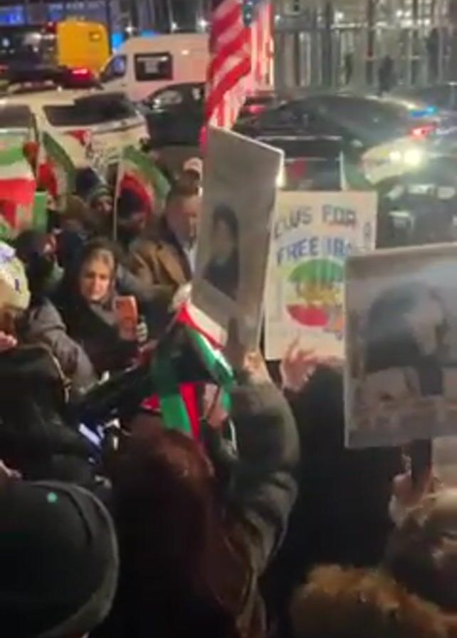 A crowd of people are protesting, holding signs and flags on a city street at night. The signs in view bear messages like "News for a Free Iran" and "This is my photo from Iran". Flags include those of the United States, Iran, and Israel. People are bundled in winter clothing, and the background shows street traffic, including police cars. The crowd appears to be diverse in age and gender. They are packed closely together, chanting.
