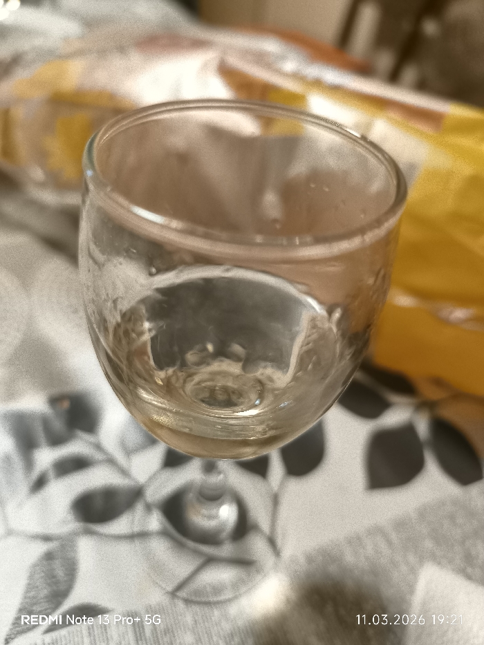 The scene depicts an indoor setting in Dolni Dabnik, Bulgaria. The primary subject is a clear, stemmed glass, likely a wine glass, positioned centrally on a light-colored surface. The glass contains a small quantity of pale yellow liquid, occupying approximately the bottom third of its bowl. Minor internal residue or condensation is visible on the glass surface. The glass rests on a tablecloth or similar surface patterned with dark grey, abstract, leaf-like motifs on a lighter background. The background is out of focus, showing indistinct shapes, including a blurred yellow object to the upper right. No individuals are visible. The image metadata indicates it was captured by a "REDMI Note 13 Pro+ 5G" on "11.03.2026 at 19:21".