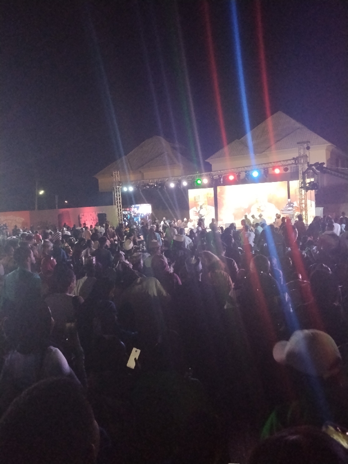 The scene depicts a large outdoor gathering at night in Fagge D2, Nigeria