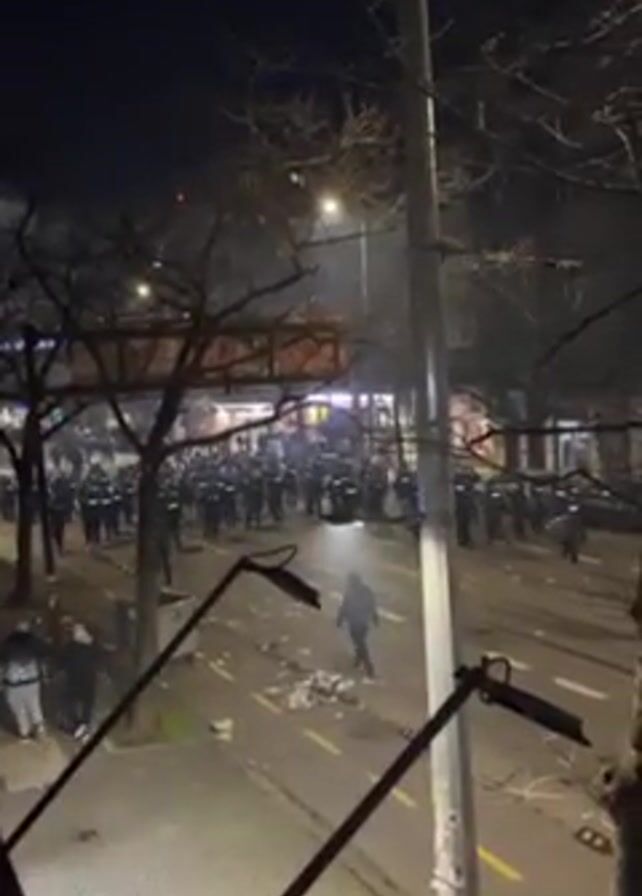 At night, a large group of police officers in riot gear are standing on a street facing the camera. There is litter and debris on the ground in front of them. Several people are standing in front of the police line. Behind the police line, there are shops and buildings. There is a pedestrian bridge crossing the street. The camera is positioned at an elevated angle, looking down at the scene. There are bare trees on both sides of the street. A loud noise can be heard.