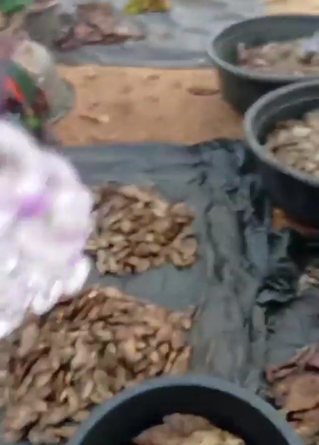n outdoor market setting with people selling dried fish. The fish are arranged on black tarps and in black plastic tubs and woven baskets. Several individuals are visible, either sitting next to their fish or walking through the market. The ground appears to be a reddish-brown dirt. One person is seen holding a white plastic bag. The overall environment suggests a bustling, open-air marketplace.