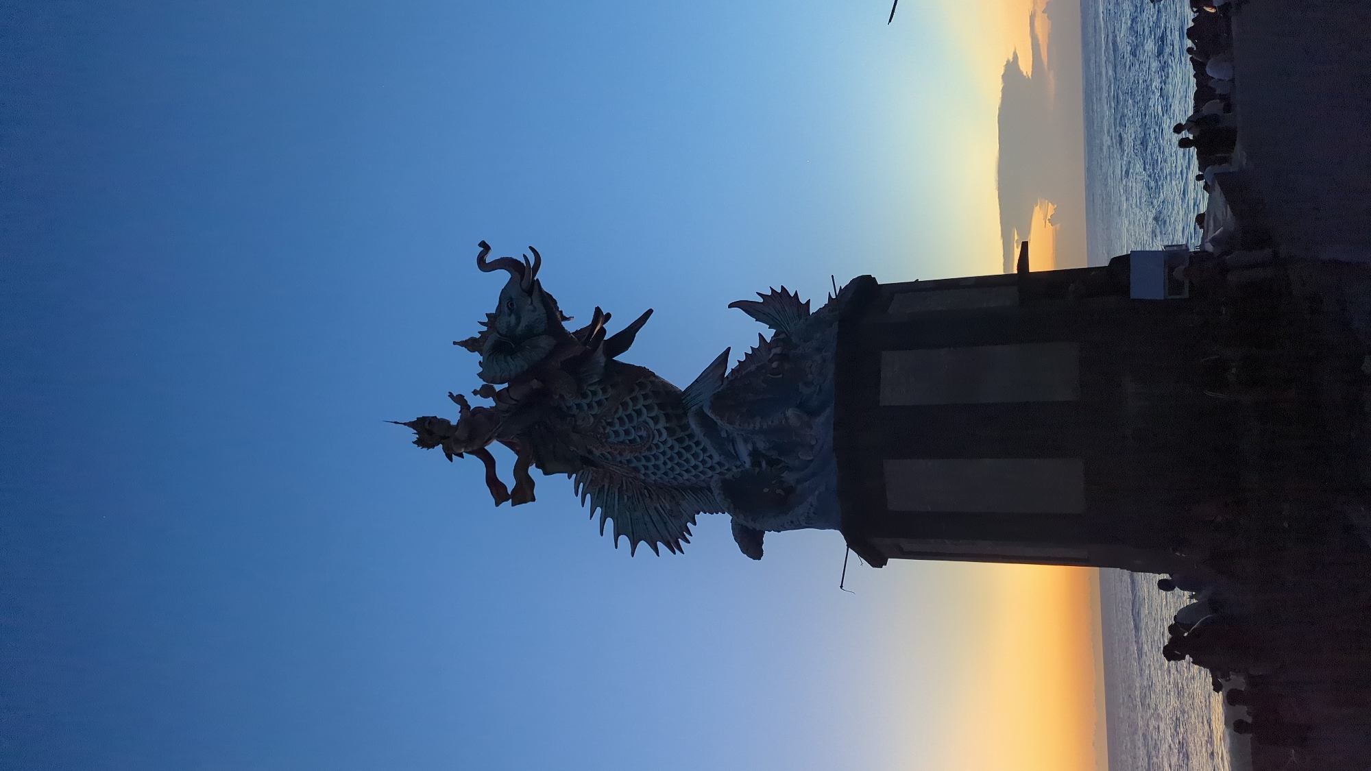 The image captures a statue of a Barong at sunset in Pererenan, Indonesia. The statue depicts a mythical creature, and is mounted on a pillar. The sky is blue, transitioning to orange as the sun sets over the ocean. The sea is visible in the distance, with people seen on the beach.
