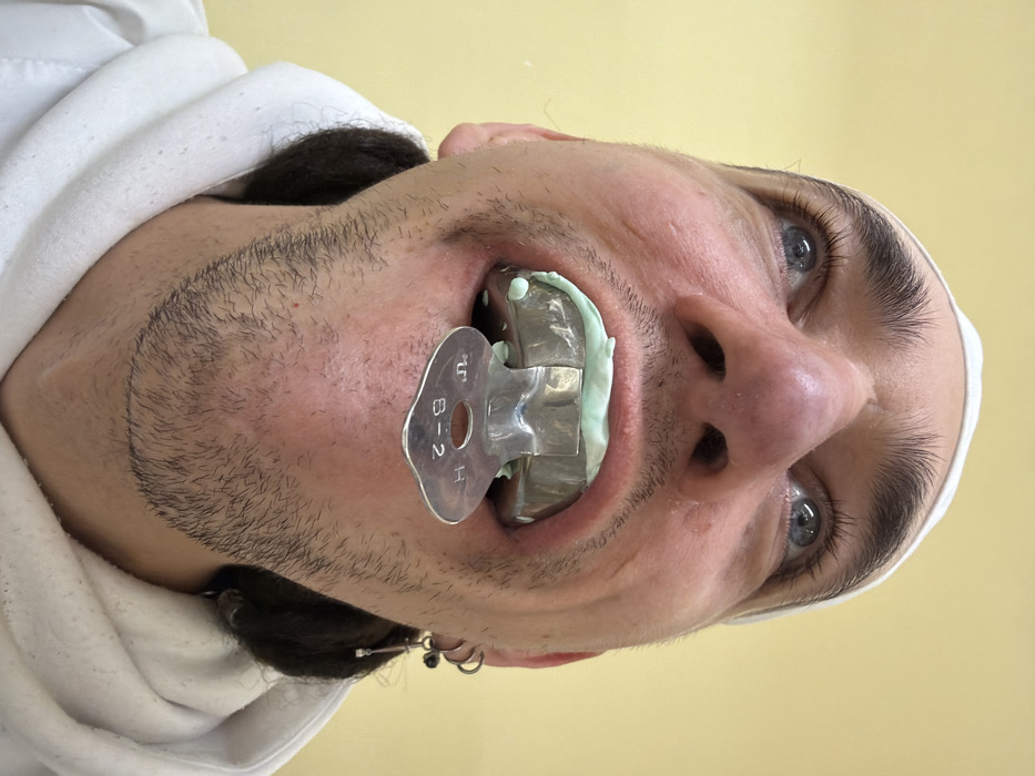 A person's face is shown from a low angle, with their head tilted back. They have gray eyes, dark eyebrows, and facial hair. A silver dental impression tray filled with light green putty is in their mouth. The tray has a handle with the inscription "B-2 H". The person wears a white covering, likely a medical gown or head covering. A dark ponytail is visible near their ear, adorned with multiple earrings. The background is a plain, light yellow wall.