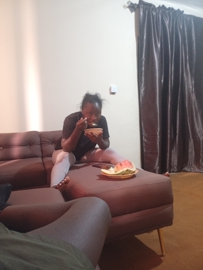 The image depicts an indoor residential living room in the city of Unknown, Unknown. A person with dark skin, wearing a dark short-sleeved top and light-colored pants, is seated on a brown upholstered sectional sofa, actively eating from a light-colored bowl with a spoon. This individual's bare feet, displaying white nail polish, are visible on the sofa. Adjacent on the sofa, a yellow plate contains sliced watermelon and other items, positioned next to a dark-colored smartphone. In the foreground, the lower body and legs of a second person, clad in olive green apparel, are visible, indicating their presence. The background consists of a light beige wall with a white electrical outlet and dark brown, possibly satin, curtains drawn on the right. The floor is covered with a light brown carpet.