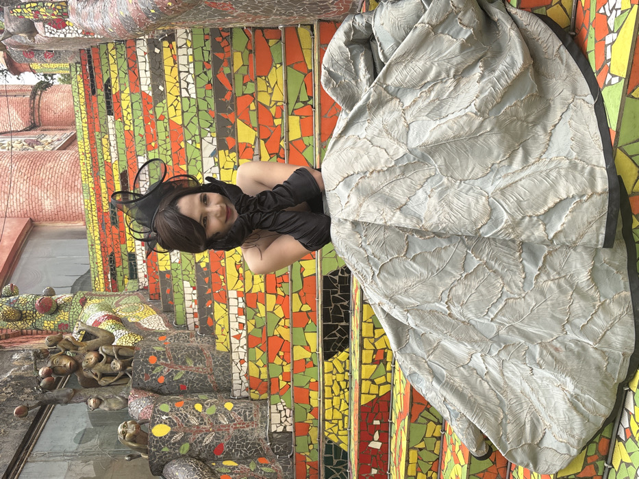An outdoor scene in Baqiao, China, depicts a woman posing on a brightly colored mosaic staircase. The woman, with medium-length brown hair and light skin, is centrally positioned, sitting on the steps. She wears a strapless black top, long black opera gloves, and a voluminous light grey-green full skirt or dress featuring a textured, leaf-like pattern. A black fascinator with looped elements adorns her head. Her gloved hands are placed under her chin, supporting her cheeks, as she looks slightly to her left with a faint smile. The staircase behind her is extensively covered in an irregular mosaic pattern composed of red, orange, yellow, green, black, and white tesserae. To the left of the woman and ascending the stairs, a mosaic-covered pedestal features multiple brown monkey sculptures, including an adult and several juveniles. Further left, another mosaic section shows abstract tree patterns with fruit. In the upper background, architectural elements of a building are visible, including a brick structure with cylindrical sections and a large window, consistent with an artistic or themed complex. The lighting suggests an overcast sky.