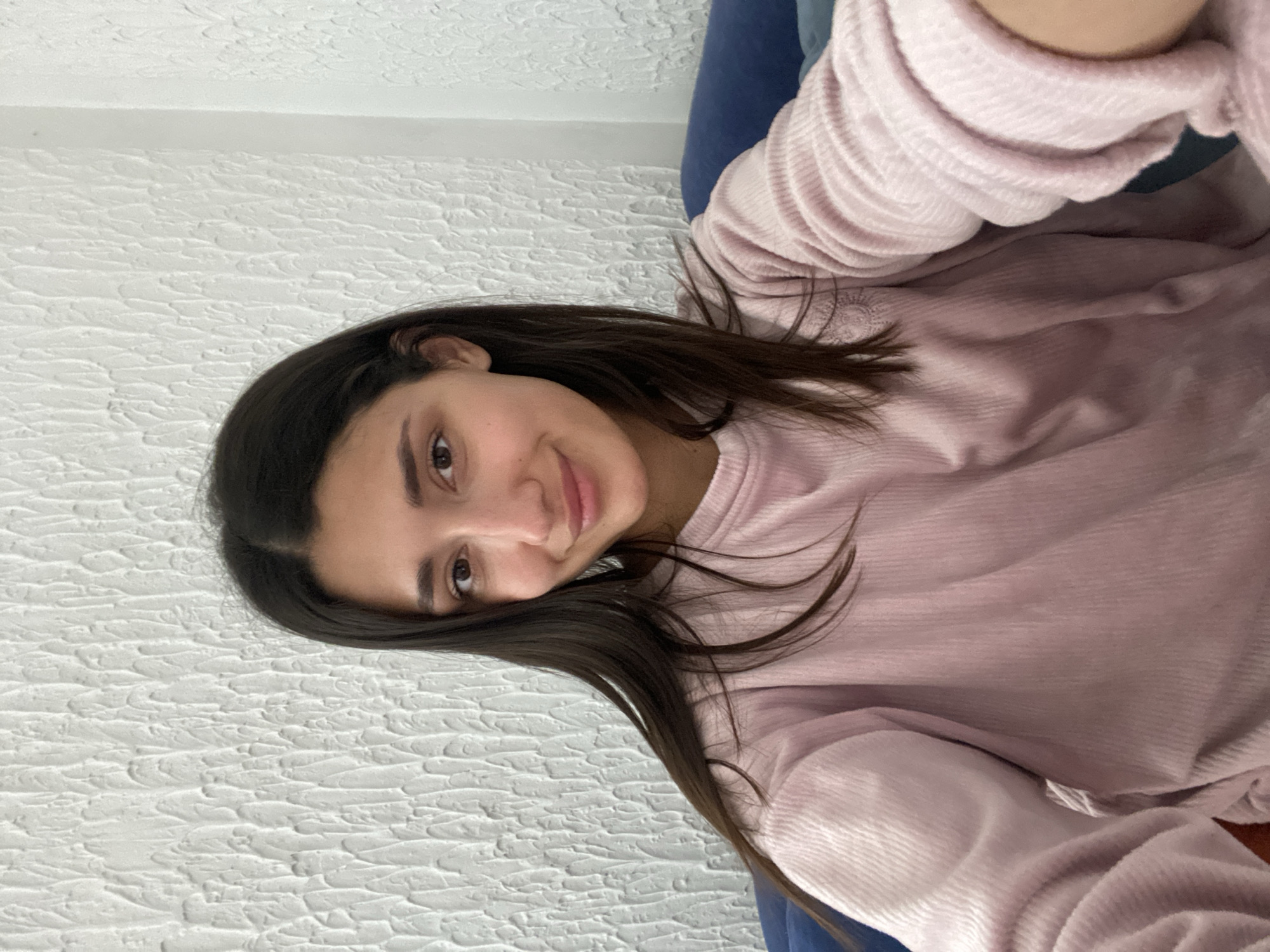 An indoor scene in Sutomore, Montenegro, depicts a single female subject from the chest up, positioned centrally. The subject is a young adult with long, dark brown hair parted in the middle, dark brown eyes, and light skin, displaying a slight smile while looking directly at the camera. She is wearing a light pink, ribbed long-sleeved top. The background features a white wall with a prominent rough, textured finish, covering the upper and left portions of the frame. A dark blue sofa or cushion is visible on the right and lower right, suggesting she is seated or leaning against it. A vertical white wall edge is discernible on the far right. The image appears to be a self-portrait.