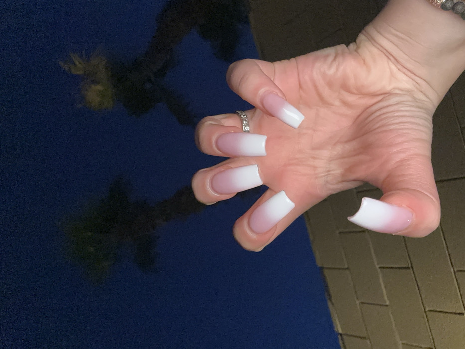 The image features a close-up of a human hand, likely female, positioned in the foreground against a dark blue evening or night sky. The hand displays five long, square-tipped artificial nails, each exhibiting a pink-to-white ombré gradient; the thumbnail is visibly chipped or broken at its distal end. A silver-toned eternity band ring, set with clear stones, is present on the ring finger. A dark-colored, possibly beaded, bracelet is partially visible on the wrist. In the background, two palm trees are silhouetted against the dark sky, with their fronds faintly illuminated. A light brown, horizontally coursed brick-like wall or structure is visible in the lower-left quadrant. The outdoor setting, characterized by palm trees and a dark sky, is consistent with a location in Las Vegas, Nevada, United States.