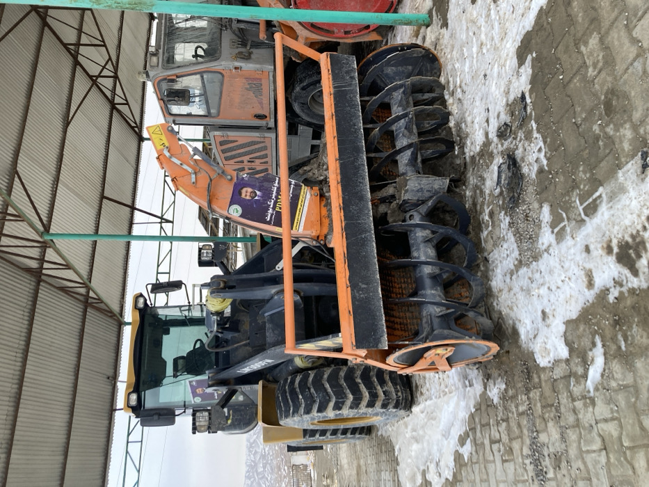 The image depicts a scene of heavy machinery parked under an open-sided shelter with a corrugated metal roof supported by green metal poles, located in Kan Mehtarzai, Pakistan. In the foreground, a large yellow wheel loader, bearing the identifier "LG936FN" on its lifting arm, is equipped with a prominent orange front-mounted snowblower attachment featuring a multi-bladed auger. Two identical political posters are visible; one affixed to the cab of the wheel loader and another to the orange snowblower. Each poster displays the image of a bearded man, alongside text in an unknown script and the acronyms "PDM" and "PDMA." Partially visible behind the snowblower is an older, orange-red utility vehicle with a cab. The ground directly beneath and around the machinery is paved with grey interlocking bricks, interspersed with melting snow, dirt, and gravel patches. The distant background reveals a barren, hilly landscape under an overcast sky. No individuals are present in the scene.