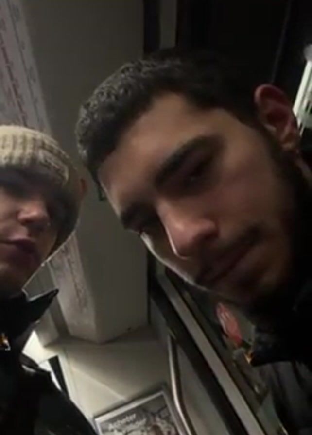 two men standing in what appears to be a train car. The camera is held close to the two men. One man, on the left of the frame, is wearing a beanie and dark jacket. The other man, on the right, has dark hair and a beard. The background of the train car is visible, including a route map and an advertisement in French. The first man speaks, asking the second man how he feels after one day without him. The second man looks at the camera and pauses, possibly considering an answer.