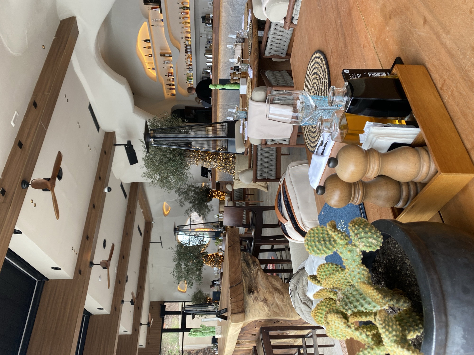 interior of a restaurant in Sveti Stefan, Montenegro. The restaurant features a bar area with a display of bottles and a counter. There are tables set with glasses, napkins, and condiments such as pepper grinders. A potted cactus is visible in the foreground, and there are chairs and tables for seating. Olive trees decorated with lights and gas heaters are located outside. The restaurant has a modern architectural design with white walls and wooden beams.