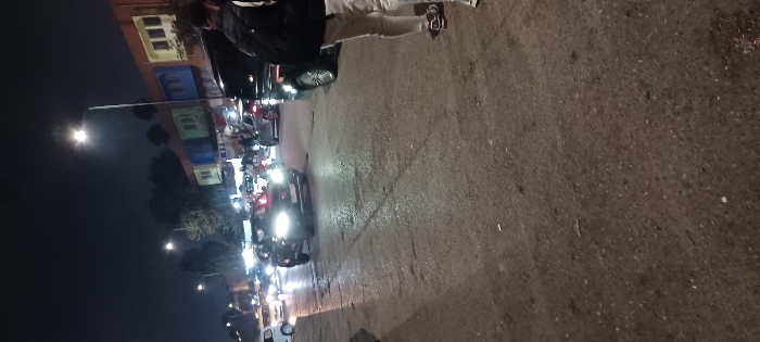 A dimly lit street scene unfolds at night. Numerous vehicles are navigating the road, their headlights illuminating the surroundings. Buildings line the street, their architectural details partially visible. A streetlamp casts a bright glow, adding to the ambient light. Pedestrians are present, but their features are indistinct due to the low light. The road surface is asphalt.