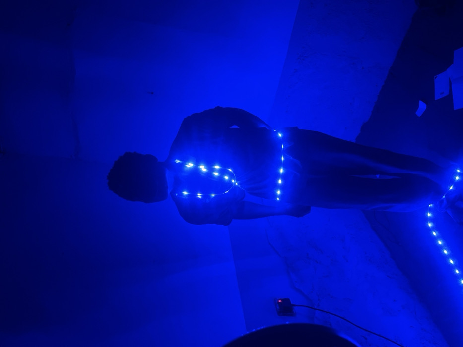 - "The image depicts a male individual standing in an indoor setting, likely a room, in Kirana, Nigeria, illuminated predominantly by blue light" by FM-kZ5TK2, licensed under CC BY 4.0