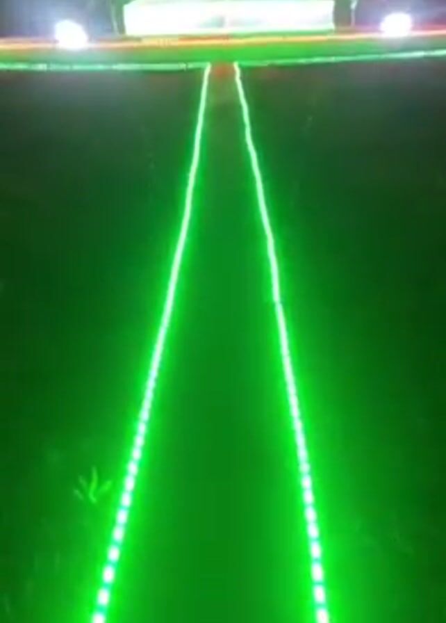 nighttime view of a lawn decorated for the holidays. A path of green LED lights leads to a white monument with a red crown-like structure on top. The base of the monument is decorated with white lights and a ring of alternating red and green LED strips. Illuminated star-shaped decorations are scattered around the base. A white building is visible in the background.