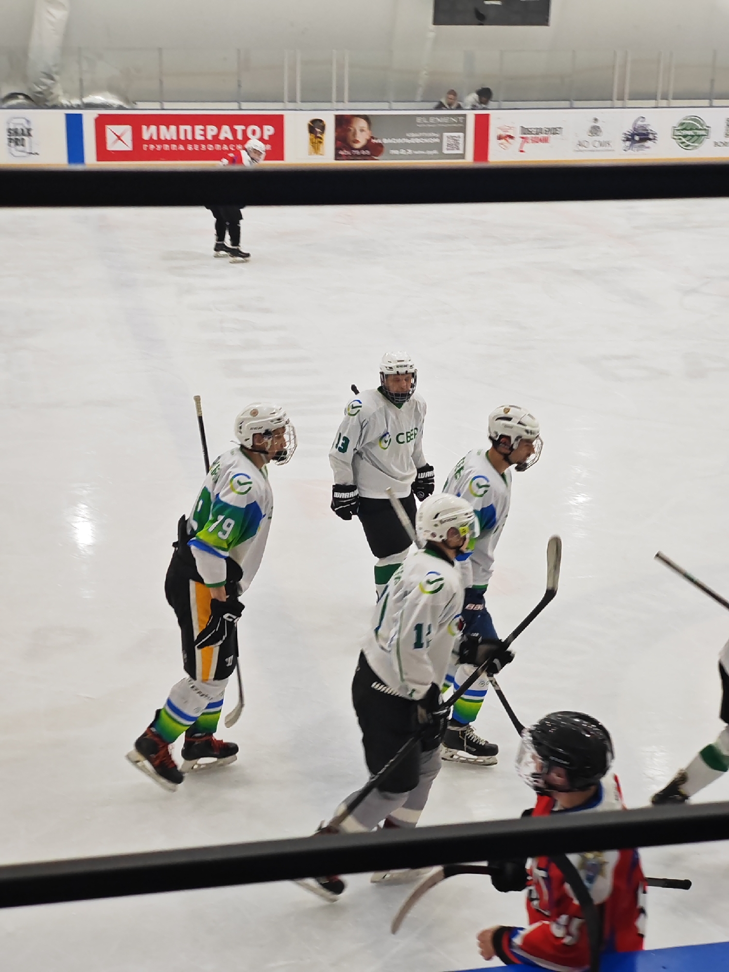 The image depicts a hockey game indoors at an ice rink. Several hockey players wearing helmets, jerseys, and skates are visible on the ice. The team on the left is wearing white jerseys with green and blue accents, while a player on the opposing team is wearing a red, white, and blue jersey with a black helmet. The rink is surrounded by advertising banners with Russian text, including one that says "ИМПЕРАТОР." The photograph was taken indoors at an ice rink in the city of Saint Petersburg, Russia.