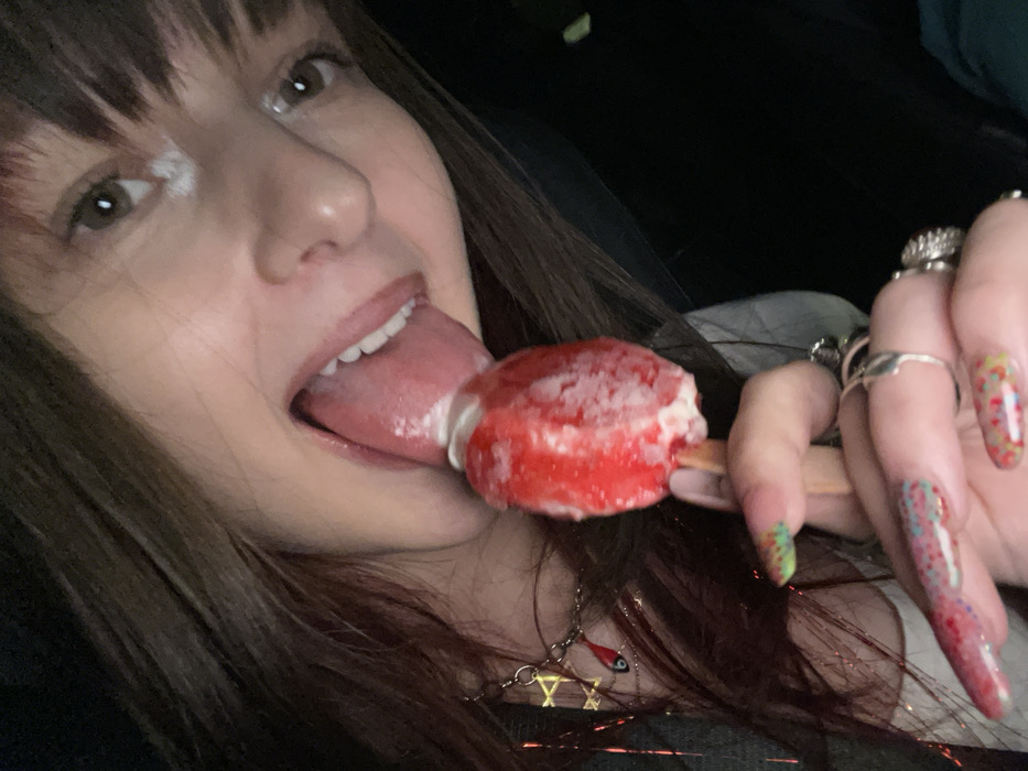 A woman licks a red and white popsicle. Her long, decorative fingernails hold the popsicle stick. She has brown hair and eyes, bangs, and visible silver rings. A Star of David necklace is also visible around her neck. Part of her face is powdered white. The scene appears to be lit indoors, perhaps within a car.