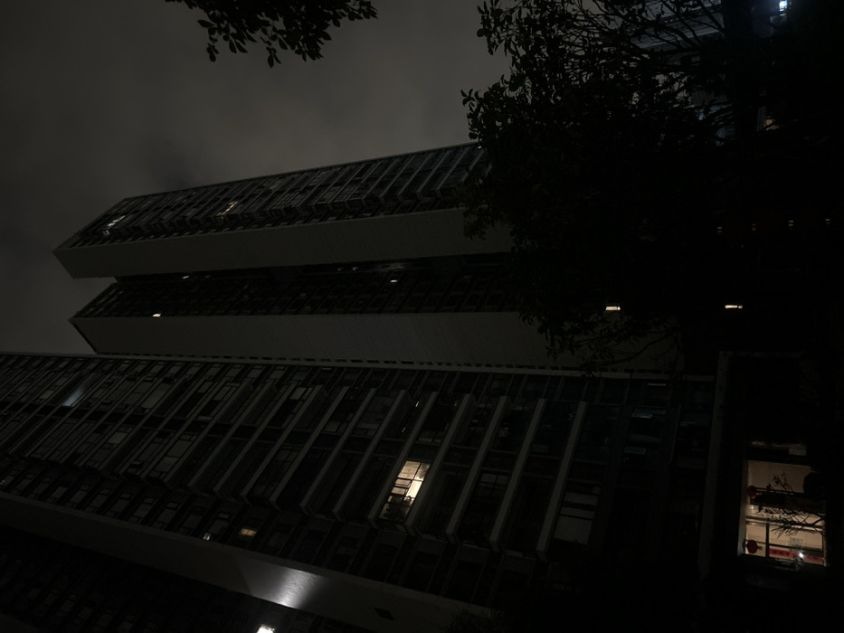 A low-angle shot captures a modern building at night. The structure has multiple floors with rows of windows, some illuminated. Silhouetted trees frame the top and right sides of the composition. The sky is overcast, contributing to the dim lighting. The architecture is characterized by clean lines and a geometric design, with emphasis on the repetitive window patterns.