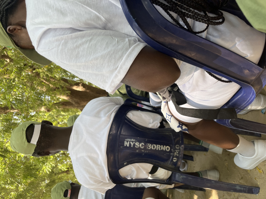 The image depicts an outdoor gathering in Maiduguri, Borno State, Nigeria, likely at an NYSC (National Youth Service Corps) camp or facility