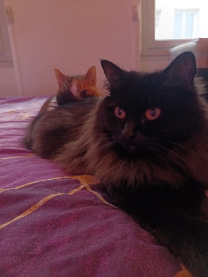 Two cats rest on a purple bed with gold stripes. The cat in the foreground is predominantly black with long fur around its neck and amber eyes. Behind it, an orange cat is partially visible, its head resting on the back of the black cat. A window with a white frame and a white door is visible in the background. The lighting is subdued.