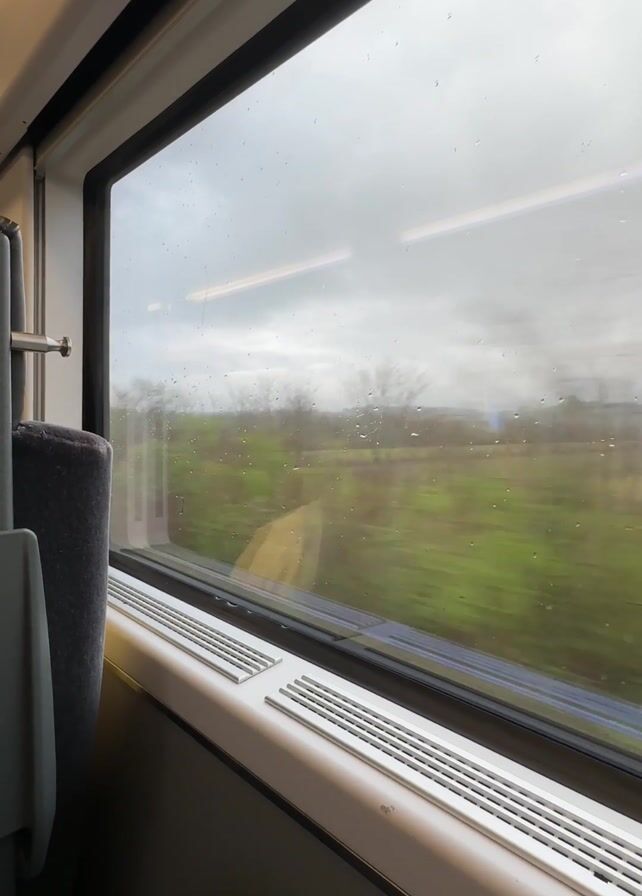 The view outside a train window showcases a countryside scene under a cloudy sky